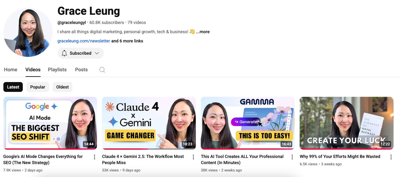I found Grace Leung’s YouTube channel while trying to level up my AI marketing workflows.