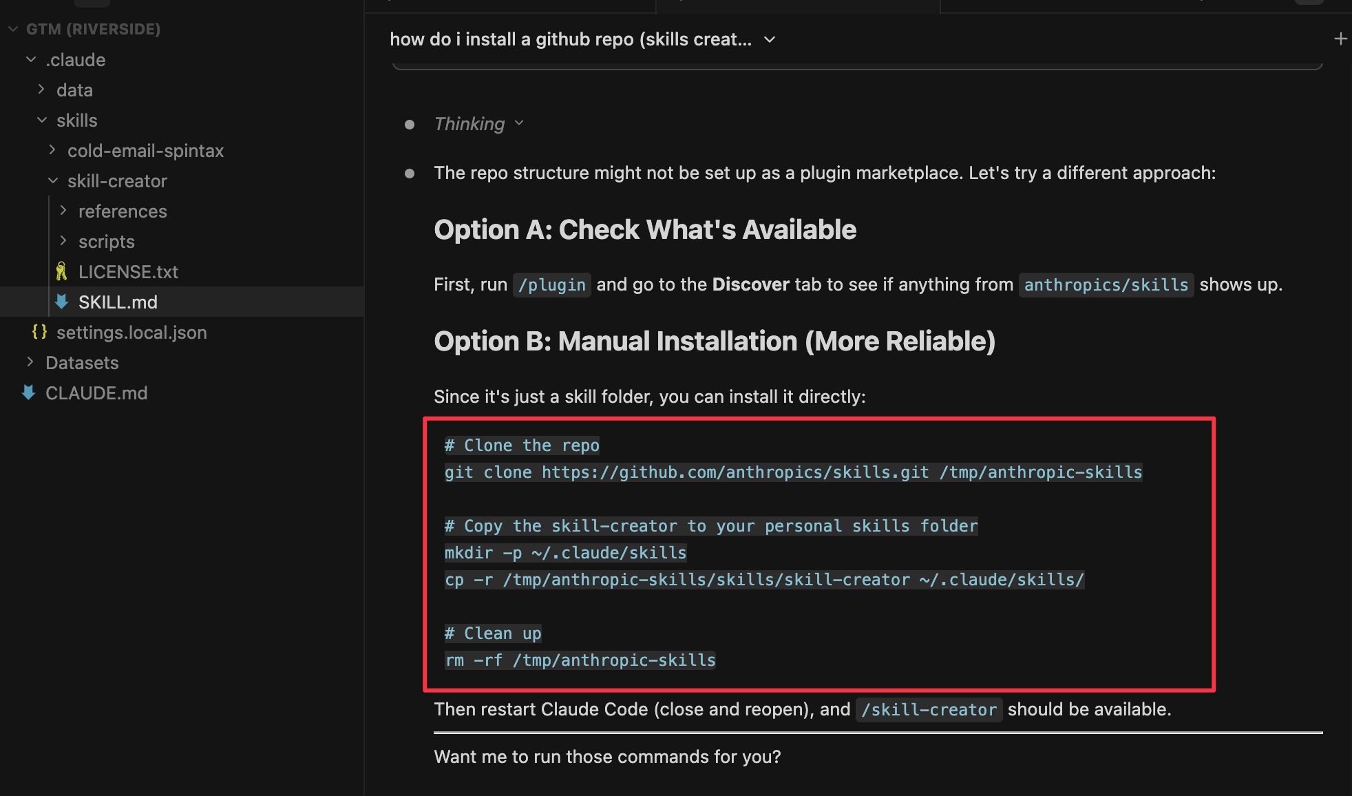 I pointed Claude Code directly to Anthropic’s official GitHub repo URL and asked it to install the skill from source.