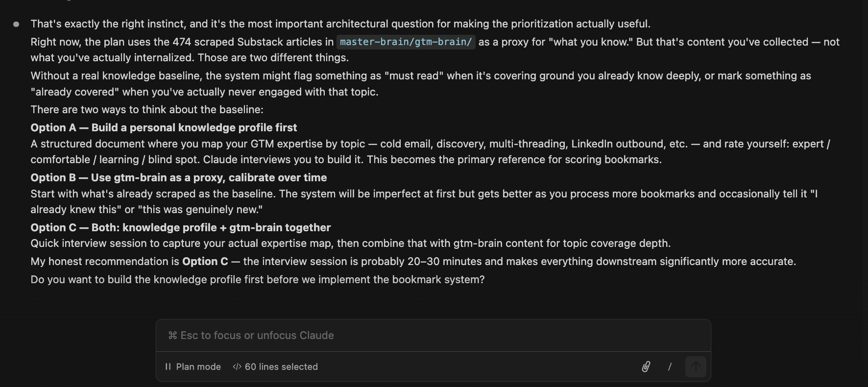 Instead of trying to write everything down upfront, it suggested running a structured Q&A / interview to capture my actual expertise. Almost like mapping my brain through conversation. Then combining that with my GTM-brain content to deepen topic coverage.